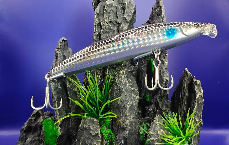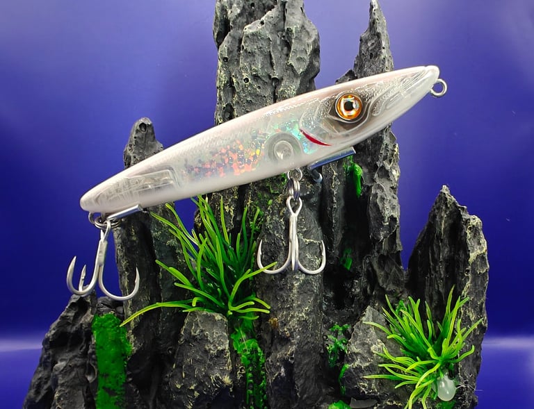 The SlingShot surface irons from Ocean’s Legacy feature a unique stainless steel wire-thru design crafted in zinc alloy, enabling a longer shimmering flutter effect on the drop compared to other materials. With chrome anodization, UV resin coatings, and Japanese foils, these irons offer enhanced shine. The SlingShot surface irons include three glow ridges on the belly, enticing fish and boosting hit rates.