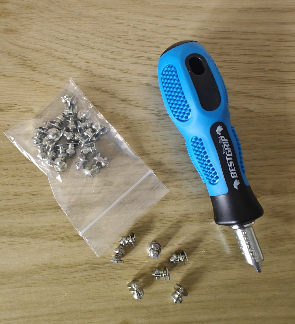 And here is the final result above the image: 12 studs fitted to each boot, and all set for trying out my new boots. The soles were quite hard on these boots, and a couple were a bit difficult to get exactly right, but overall they are looking good.